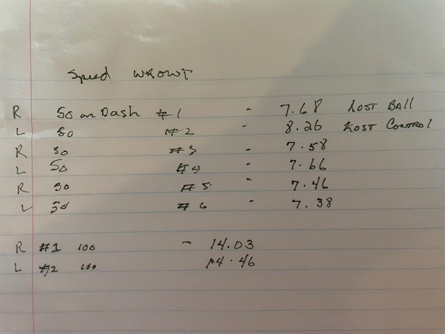 Vinny was a huge proponent of using the track to build endurance and speed. Because of this, I spent many summer mornings in 1993 running in circles at Rocky River High School while dribbling a basketball. The above picture is one of those famous “Speed Workouts” written in his distinct penmanship. Not having seen this notebook in a few decades, two things stood out as I paged through the unique little time capsule. One, my times dribbling with both hands steadily improved. Two, whatever malfunctions I had while doing the drill were clearly noted. I’m gonna guess “losing control” pertained to my temper—something Vinny’s workouts eventually helped me rein in.