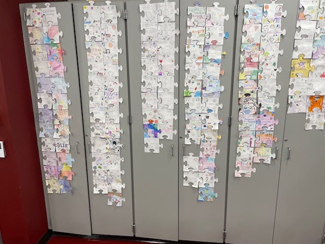 One of my favorite analogies for jigsaw puzzles is that they are much like a sports team. Every piece matters. Some will certainly stand out more than others, seeming more important than a a basic, non-descript, solid-colored piece. But at the end of the day, every piece is needed for completion. There is no piece above the other, because if you are missing just one, that spot creates a void that becomes all too noticeable. My colleague, Makenzie, uses a similar concept each year when she describes each student as a puzzle piece that makes each period of the day whole. The picture up top is from her classroom.